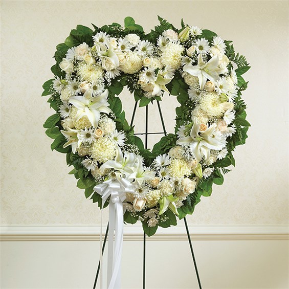 The enduring love you feel for them will keep them always remembered. This sentiment is best captured with our standing, open heart-shaped arrangement in all white. Handcrafted by our caring florists with an assortment of flawless white blooms, it is a magnificent tribute fitting for the funeral services.