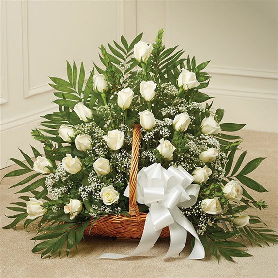 Send a message of sympathy, love and hope with this basket of white roses.• Our florists create this special sympathy arrangement in a fireside basket filled with two dozen long stem white roses• Accented with Baby’s Breath, Monte Casino, and more• Usually sent by family members, friends or business associates• Delivered directly to the funeral home• Our florists choose only the freshest flowers available so varieties and colors may vary• Measures approximately 26”H x 34”L